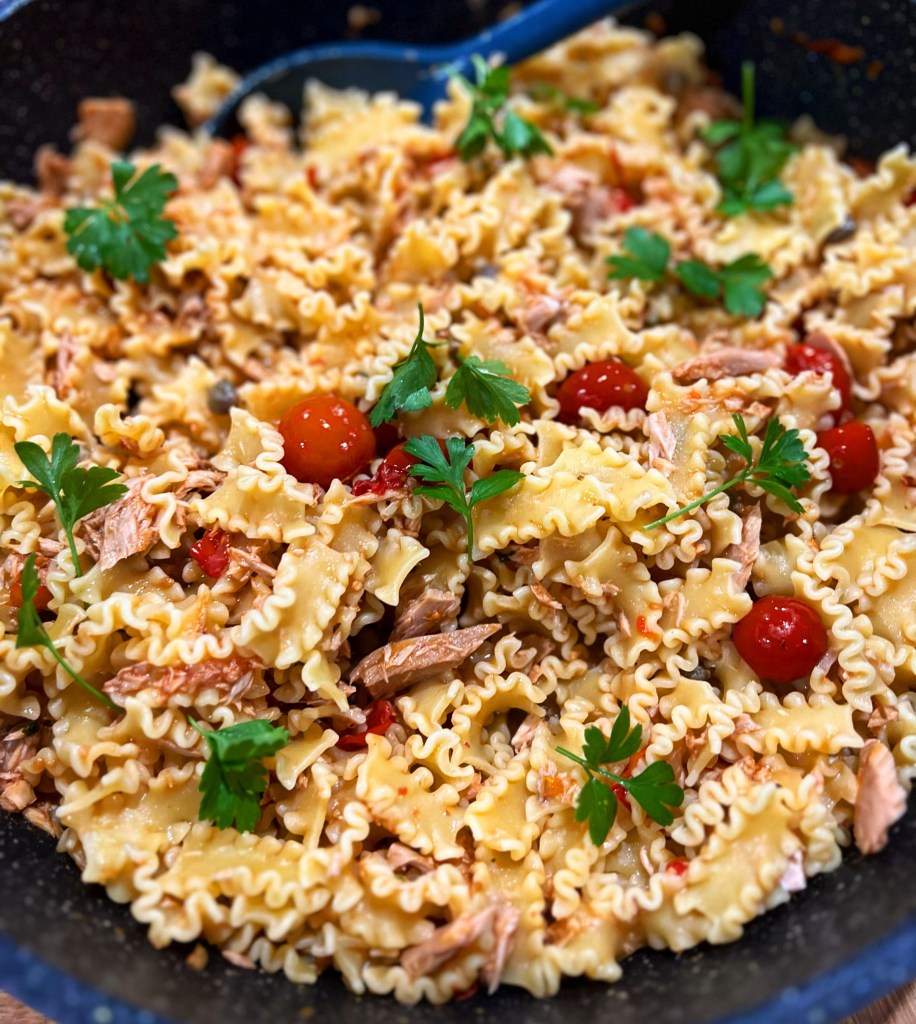 Pasta al tonno, or pasta with tuna, using one of my favourite pastas – Mafaldine to catch the sauce. It’s a delicious blend of brightness and freshness from the mix of tomatoes, capers and lemon, combined with the savoury depth of flavour of canned tuna. Cooking the pasta just short of al dente before adding to the sauce is best! It’s the perfect pantry meal.